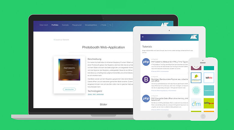 Auf der Adobe Portfolio Seite habe ich einen schönen Effekt gesehen, wie man seine responsive Webseite schön darstellen kann. Das Besondere an der Sache ist, dass die Screenshots auf den verschiedenen Geräten ebenfalls scrollen.