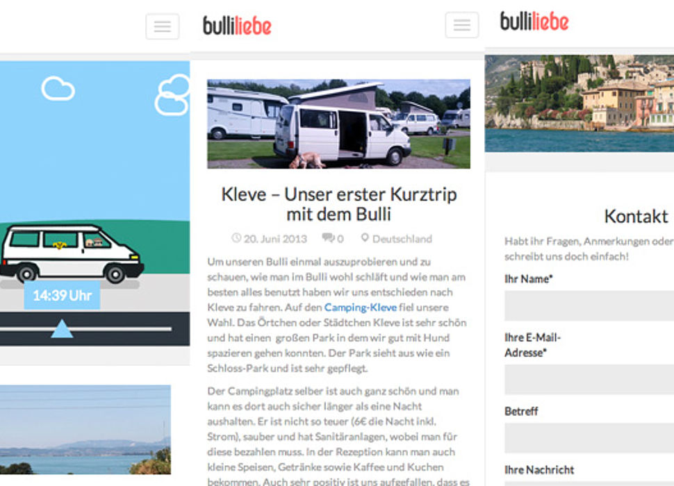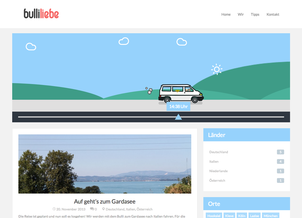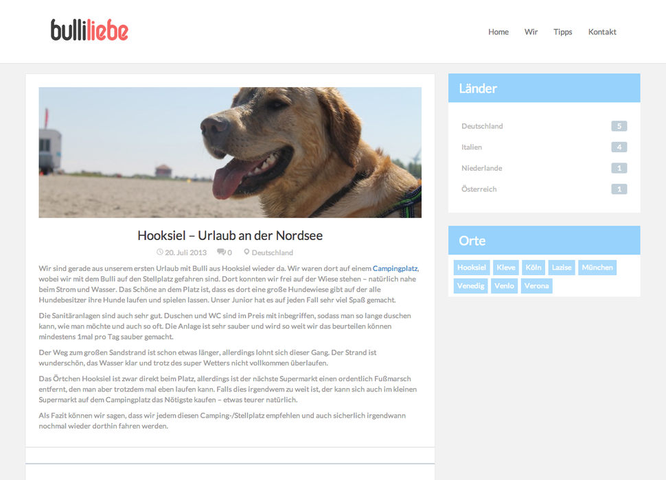 Meine Frau und ich haben uns Anfang 2013 einen Lebenstraum erfüllt und uns einen VW Bulli in der California Ausstattung gekauft. Um unsere Reisen zu teilen habe ich Bulliliebe ins Leben gerufen und einen schönen Blog erstellt. Auf dem Blog soll es um unsere Reisen gehen, sowie Tipps und Tricks was man in den verschiedenen Gebieten beachten sollte, wo man am besten langfährt, wie teuer die Maut war und wo wir schöne (Camping-) Plätze gefunden haben. Das Ganze läuft auf WordPress mit einem eigenen Theme, dass ich mit Bootstrap 3 versehen habe. So kann man die Seite auch sehr gut mobil nutzen.