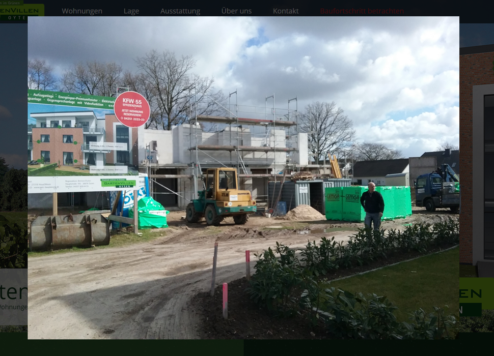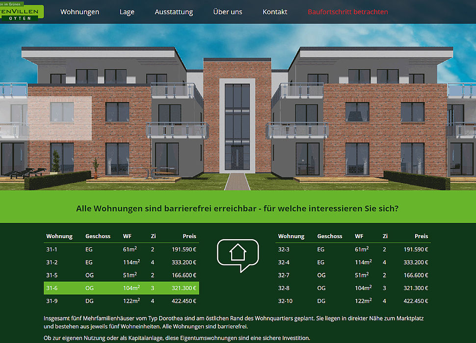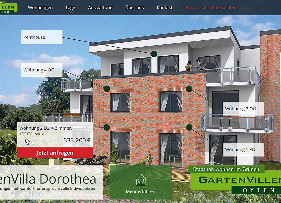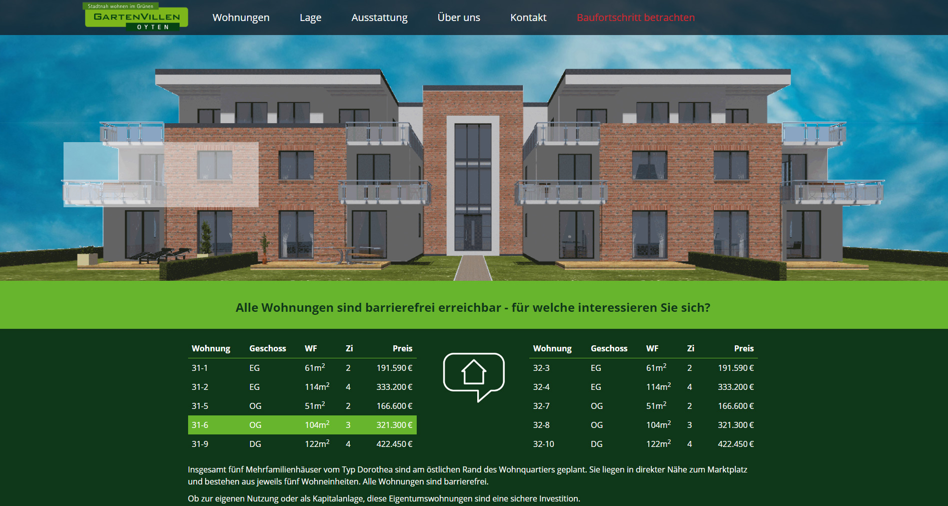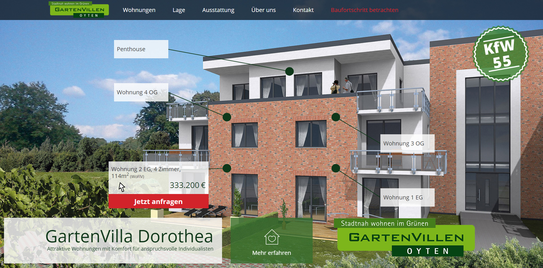Besonderes Augenmerk bei der Seite sind die beiden interaktiven Bilder der Gartenvillen, welche über die verschiedenen Wohnungen und dessen Lage in den Villen Auskunft geben. Die Auswahl hierbei wird auch für das Kontaktformular vorausgewählt um den Interessenten das Stellen einer Anfrage so bequem wie möglich zu machen.