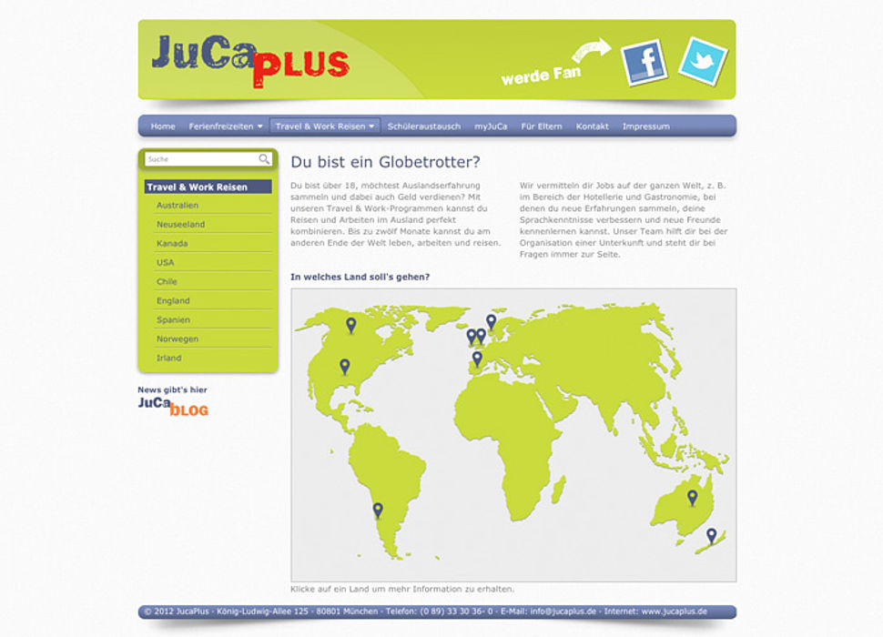 Auf einer Seite soll zudem eine interaktive Weltkarte untergebracht werden, die zeigen soll, in welche Länder JuCaPlus seine Reisen anbietet.