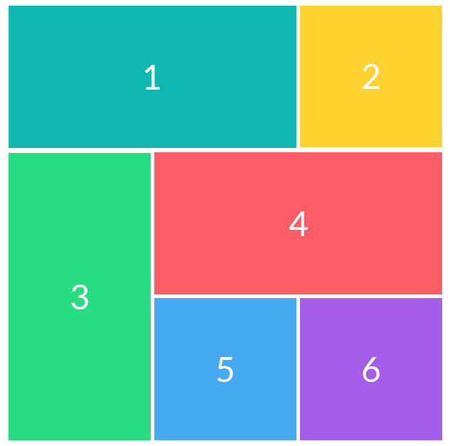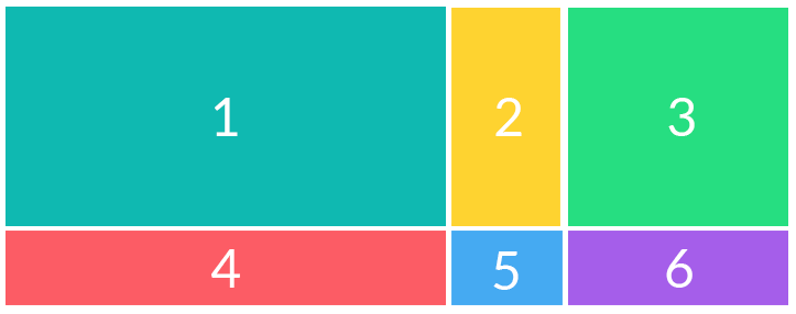 }Da wir das Markup nicht angepasst haben sehen wir nur ein 3x2 Grid, obwohl wir doch gerade ein 3x3 Grid angegeben haben. Das liegt natürlich daran, dass es nur 6 Elemente gibt. Sobald es mehr werden, werden die fehlenden Lücken automatisch gefüllt.