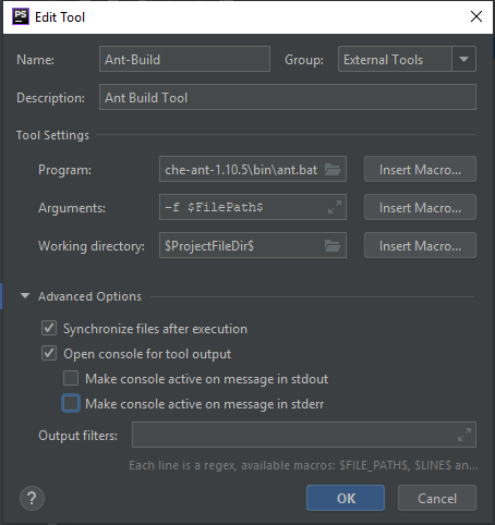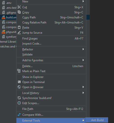 Im Gegensatz zu IntelliJ hat PhpStorm keine direkte Inegration von Apache Ant. PhpStorm bietet aber die Möglichkeit "External Tools" zu benutzen und dieses Feature machen wir uns jetzt zu nutze.