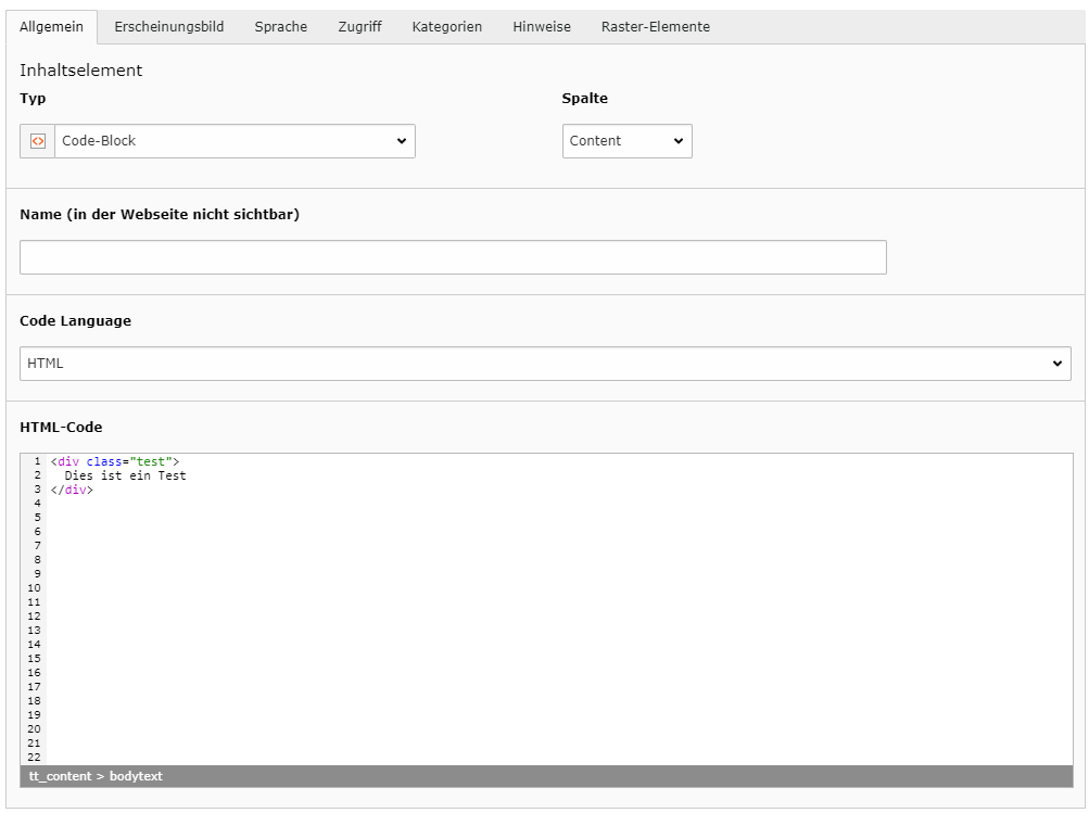 Die Extension fügt ein Content-Element names "Code-Block" hinzu. Wählt man diesen aus, so bekommt man in etwa die Ansicht, wie das HTML-Content-Element von TYPO3 mit dem Zusatz eines Select-Feldes für die Auswahl der Programmier/Hightlight-Sprache.